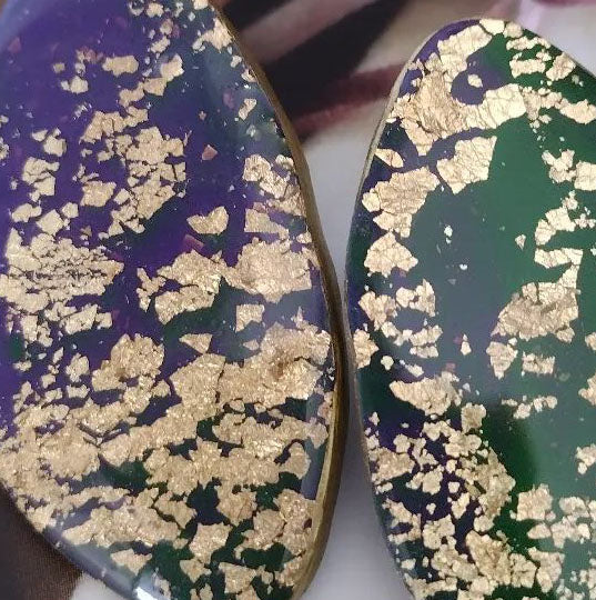 These unique earrings are a real treasure! Handcrafted in polymer clay to achieve a jasper look with flecks of gold leaf, these earrings are sure to make a statement! Everyday is a chance to show off your style, so why not add a little sparkle with these one-of-a-kind earrings?